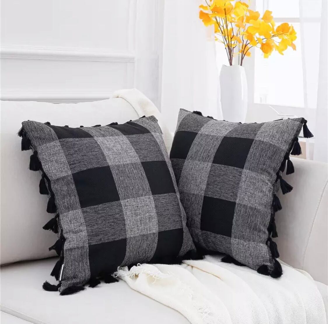 タッセル付きチェック柄のクッションカバーでさす。