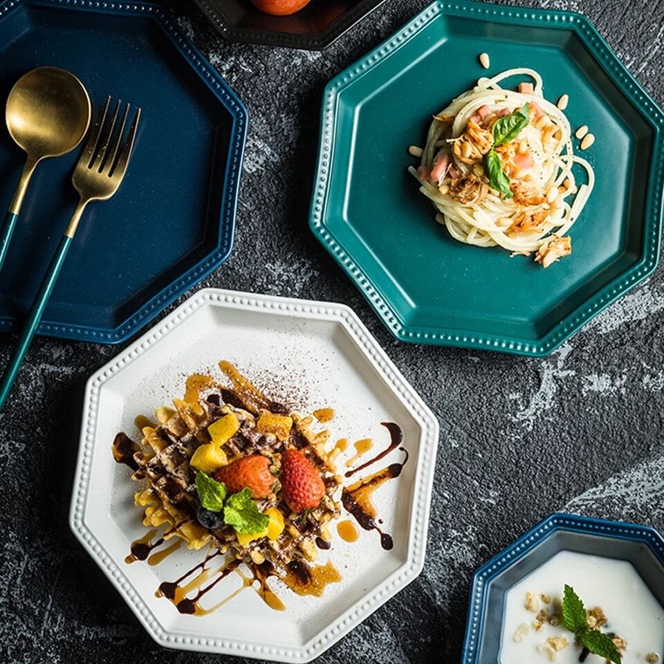 セラミックプレート八角形ディナープレート、エンボス加工でサラダやデザートのお皿に最適です。
