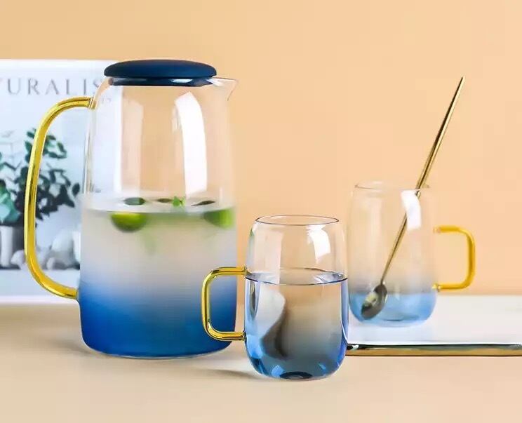グラデーションカラーがおしゃれなハンドルカップです。同デザインのガラスティーポットもございます。